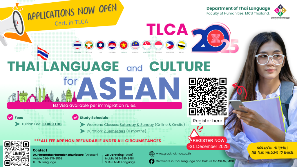 การศึกษาต่อ เปิดรับสมัครนักศึกษา หลักสูตรประกาศนียบัตรภาษาและวัฒนธรรมไทยสำหรับชาวอาเซียน (ป.ทอ.) / Certificate in Thai Language and Culture Course for ASEAN (TLCA) Read More » Phramaha Pharadon Suwannarat 08/07/2025