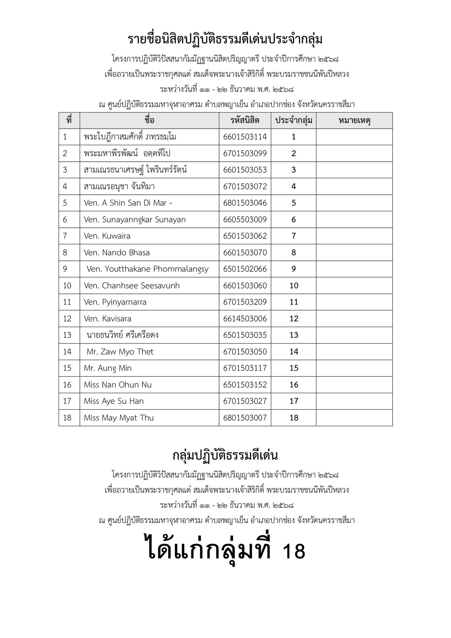 นอกจากนี้ คณะกรรมการยังได้พิจารณาให้ “กลุ่มที่ ๑๘” ได้รับรางวัลกลุ่มปฏิบัติธรรมดีเด่น ประจำปีการศึกษา ๒๕๖๘ จากผลการปฏิบัติที่เป็นแบบอย่าง ความสามัคคี และการรักษากฎระเบียบของโครงการอย่างเคร่งครัด