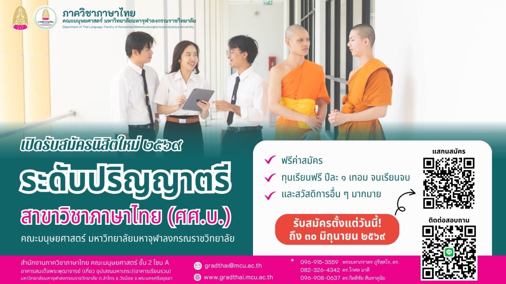 การศึกษาต่อ ขอเชิญผู้สนใจสมัครเข้าศึกษาต่อ ระดับปริญญาตรี สาขาวิชาภาษาไทย (ศศ.บ.) ประจำปีการศึกษา 2569 Read More » Gradthai MCU 24/11/2025