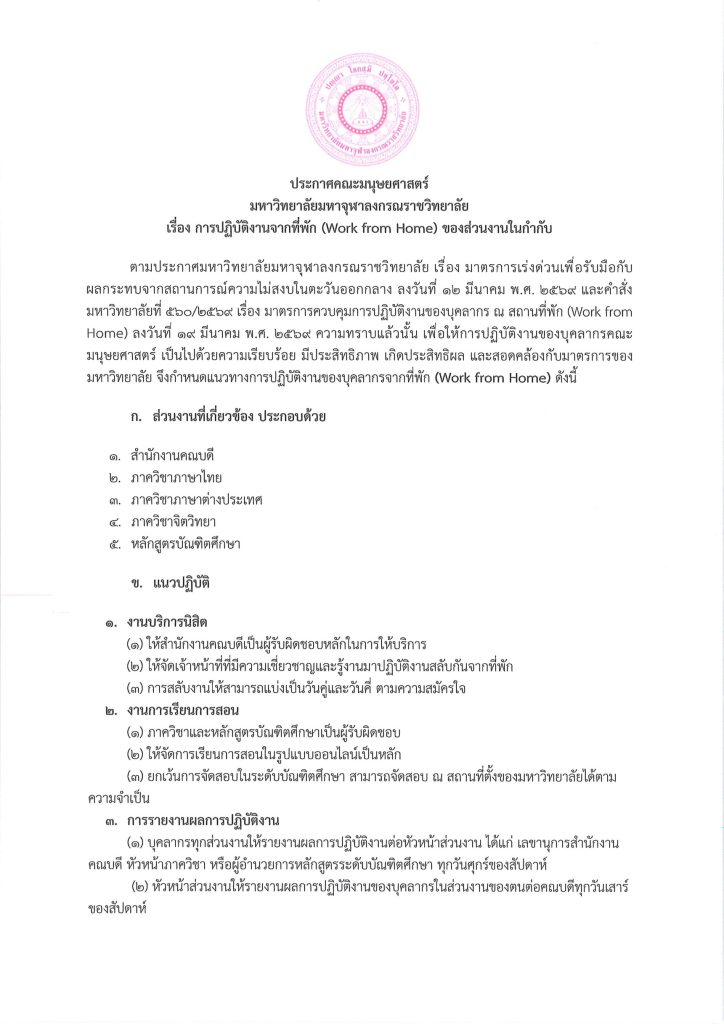 ข่าวสาร ประกาศคณะมนุษยศาสตร์ มหาวิทยาลัยมหาจุฬาลงกรณราชวิทยาลัย เรื่อง แนวทางการปฏิบัติงานของบุคลากร ณ สถานที่พัก (Work from Home) Read More » Thatchathon Attarung 08/04/2026
